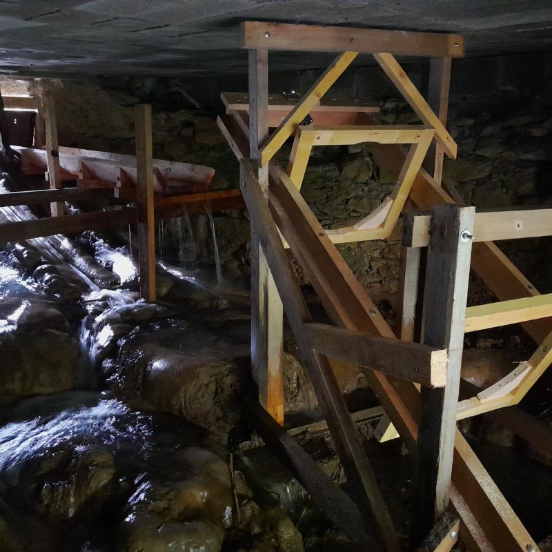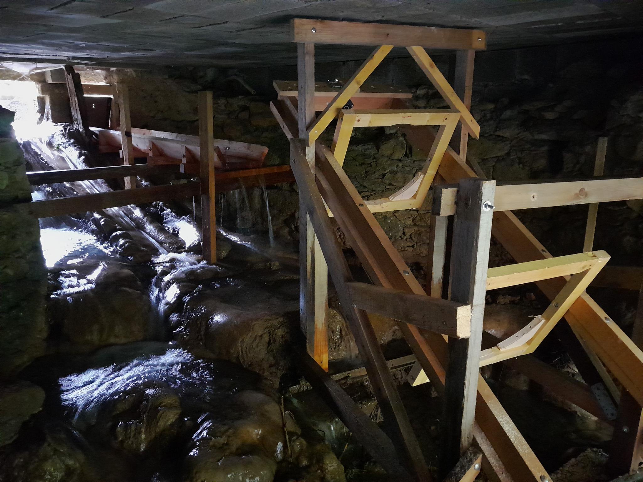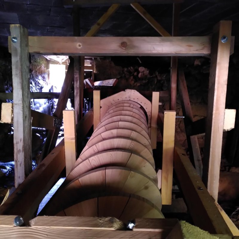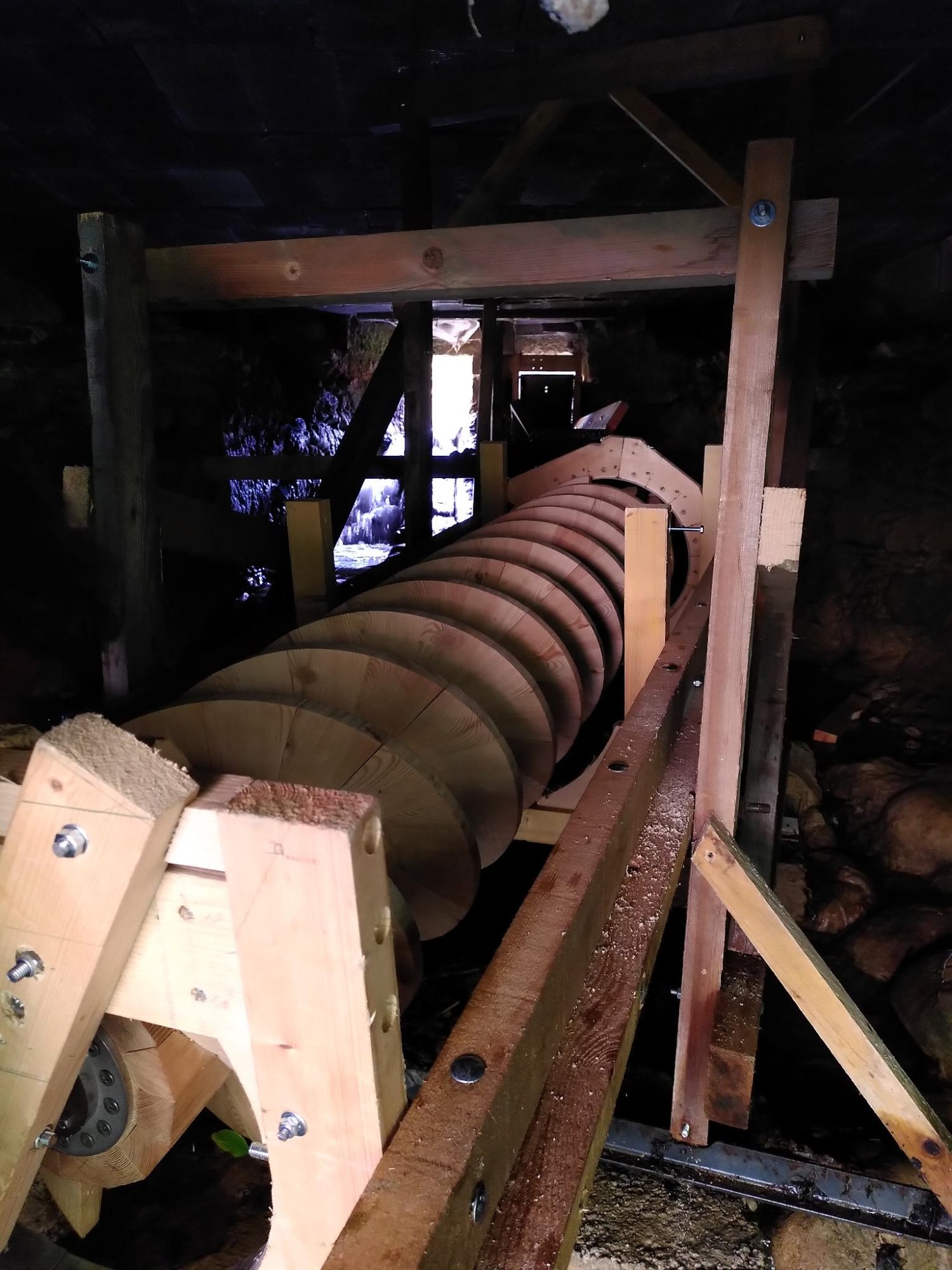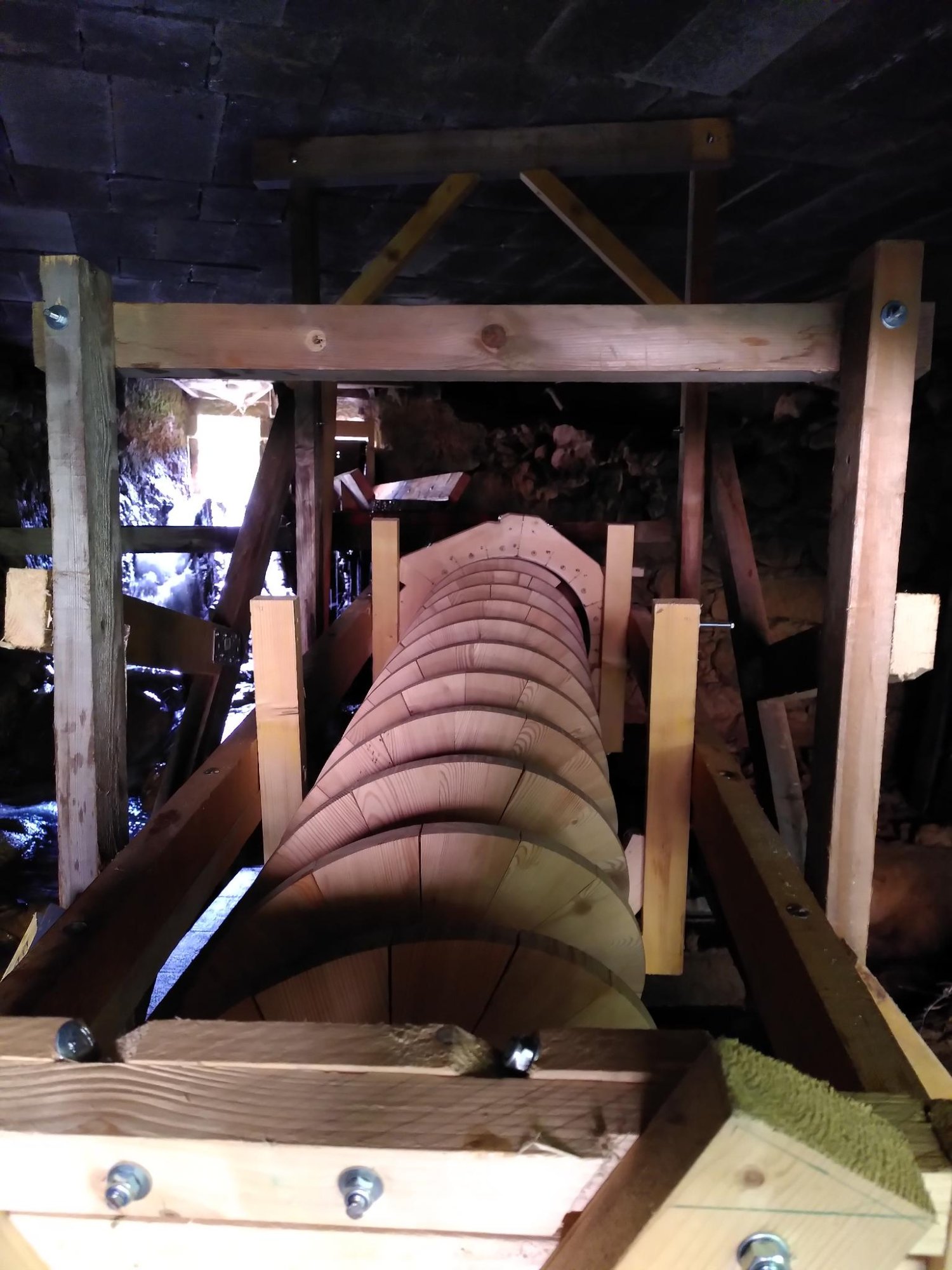 Tout a été mis en place dans la chambre d'eau qui n'attend plus que la vis tourne pour générer les premiers watts ! Prochaine étape : mettre l'auge et raccorder la conduite bois.