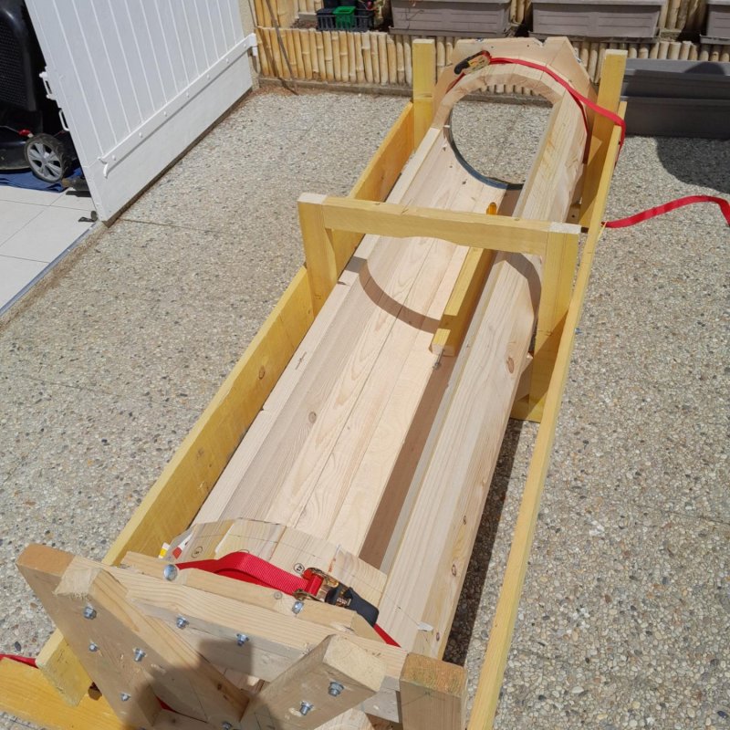 En ce mois de juin, Bertrand (notre menuisier bénévole à Saint-Gaudens) nous a ouvert son atelier. Thomas pu fabriquer la conduite avec Bertrand et sous ses précieux conseils. En deux jours, ils ont fabriqué la conduite qui est désormais placée dans la chute du moulin... sans fuite aucune !